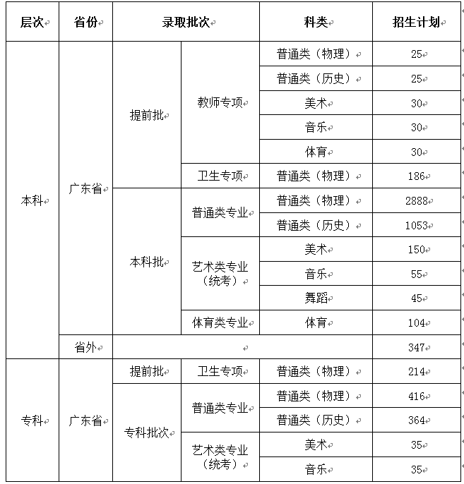 答:我校2021年普通高考招生计划为6260名,其中本科5140名,专科1120名。面向全国15个省(直辖市、自治区)招生:广东、安徽、福建、江西、河南、湖北、湖南、广西、重庆、四川、贵州、甘肃、云南、陕西、海南。此外,运动训练专业面向全国(不含港澳台)招生。