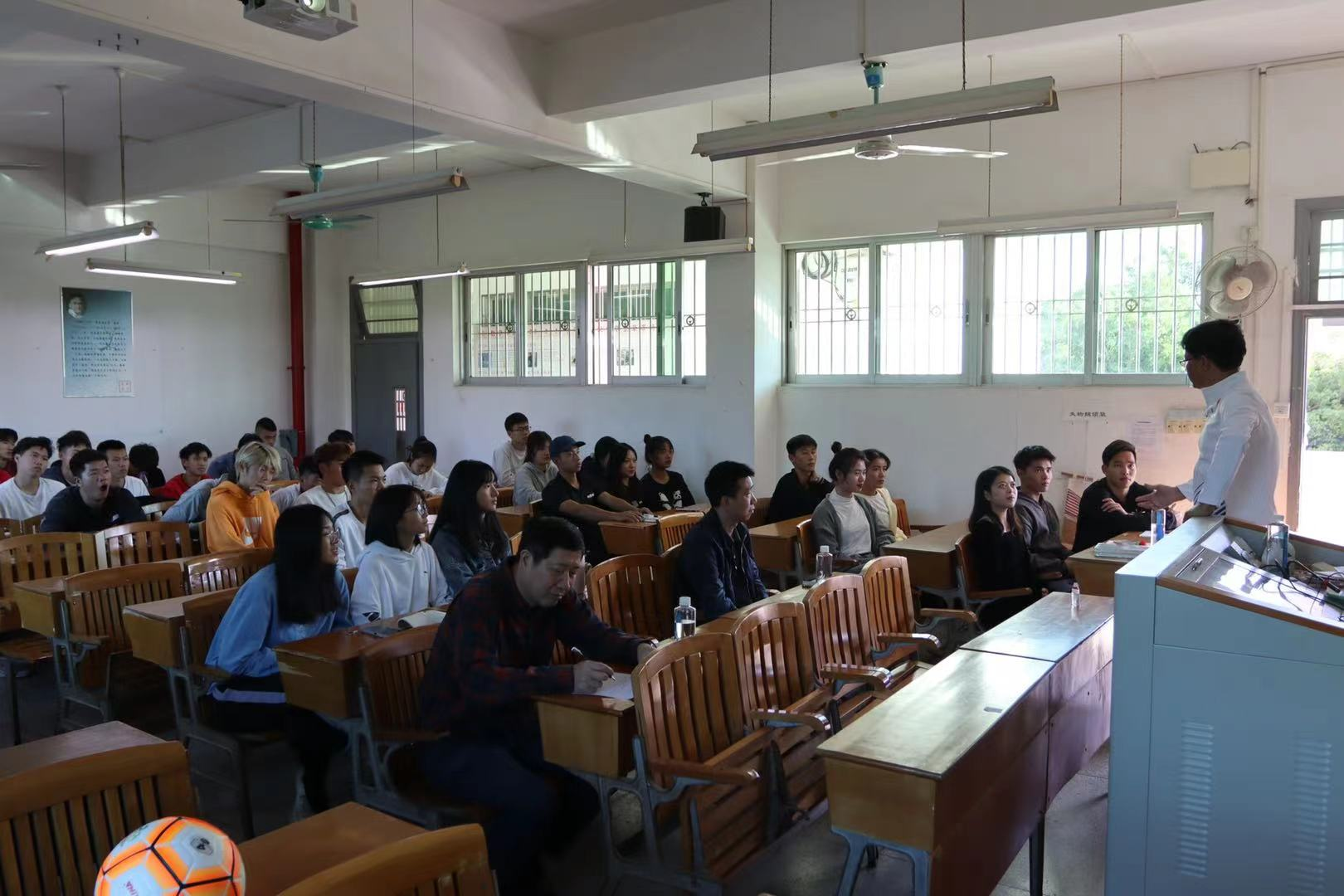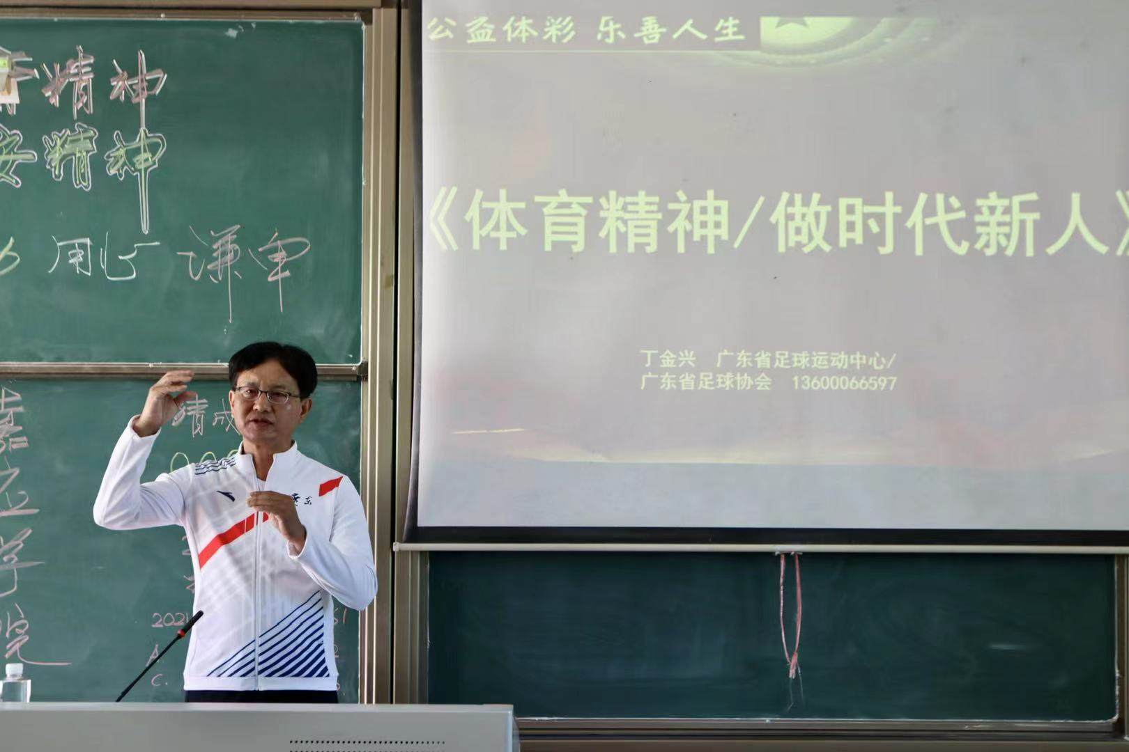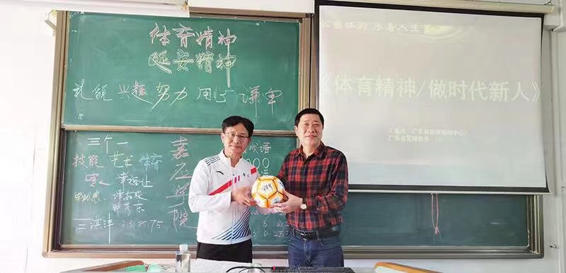 11月29日下午,广东省足球运动中心办公室主任、广东省足协副秘书长丁金兴莅临嘉应学院交流指导,为体育学院、足球(产业)学院师生作了 “体育精神——做时代新人”为主题的公益讲座。讲座由足球(产业)学院院长杜光宁主持。讲座中,丁金兴先生语言生动、幽默而又充满正气,他围绕“体育精神”的内涵,结合自己丰富的人生经历和成功的育人事迹,用自家孩子优秀的成长历程,鼓励同学们要从礼貌做起,对学习要有兴趣,要快乐学习才有快乐的未来,勉励体院学子努力学习、艰苦奋斗,砥砺意志、奋勇争先,做自强不息的时代新人。他建议同学们应将“技能、艺术和体育”三者统一起来,勇于探索、追求卓越,做自强不息的时代新人。足球(产业)学院院长杜光宁表示,此次公益讲座意义深远,丁老师深入浅出的精彩演讲让师生们形象地体会到了体育精神的魅力以及体育精神对于时代新人培养的重要性,对往后我们端正人生态度与把握人生哲学有积极的指向作用,他勉励同学们时刻准备着,把体育精神和国家的时代要求紧密联系起来。